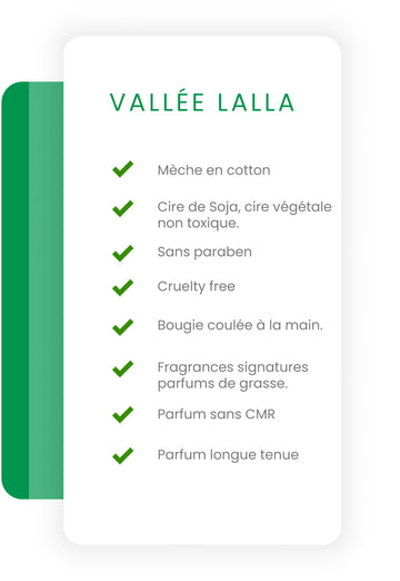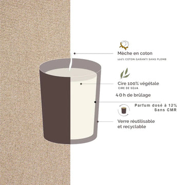 Cire végétale, Parfum de Grasse, Mèche 100% Cotton, Sans Paraben, Sans Phtalates. Non testés sur les animaux.